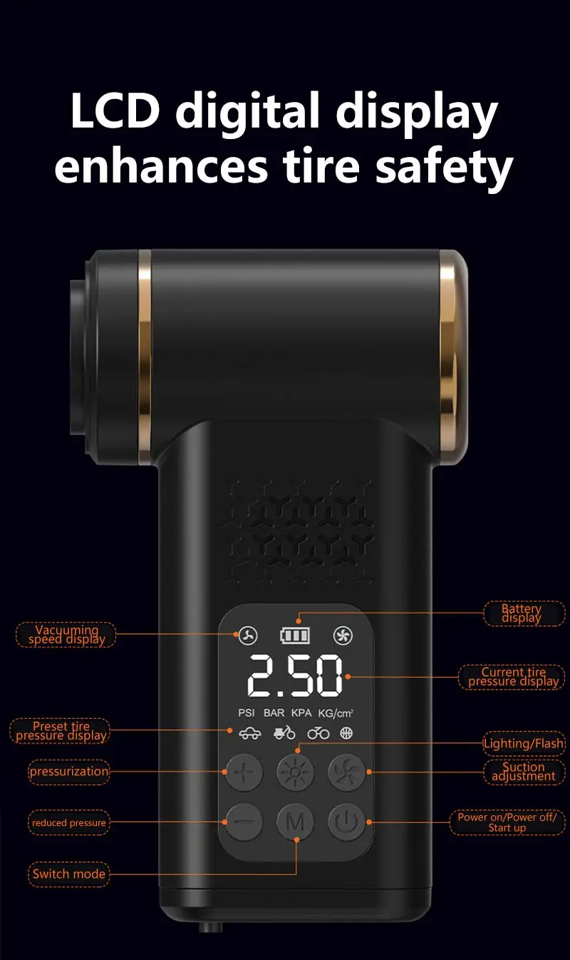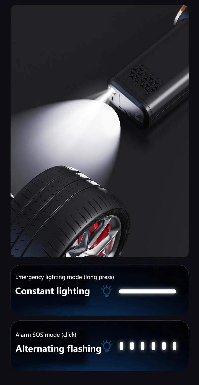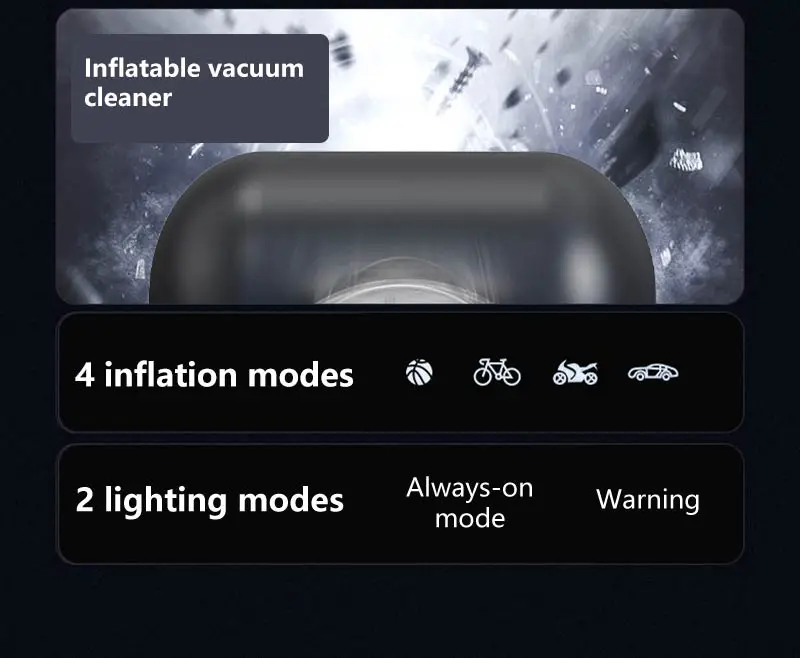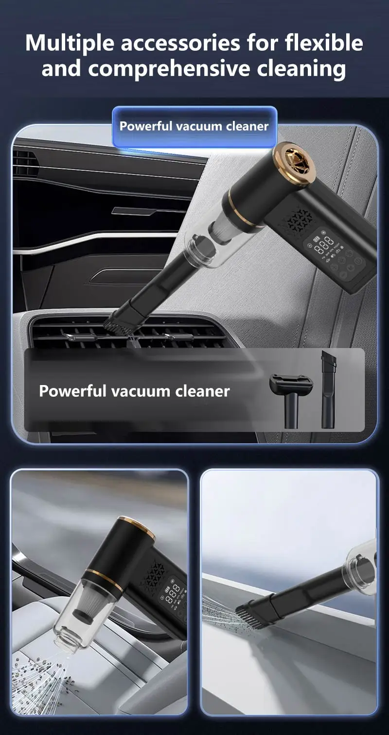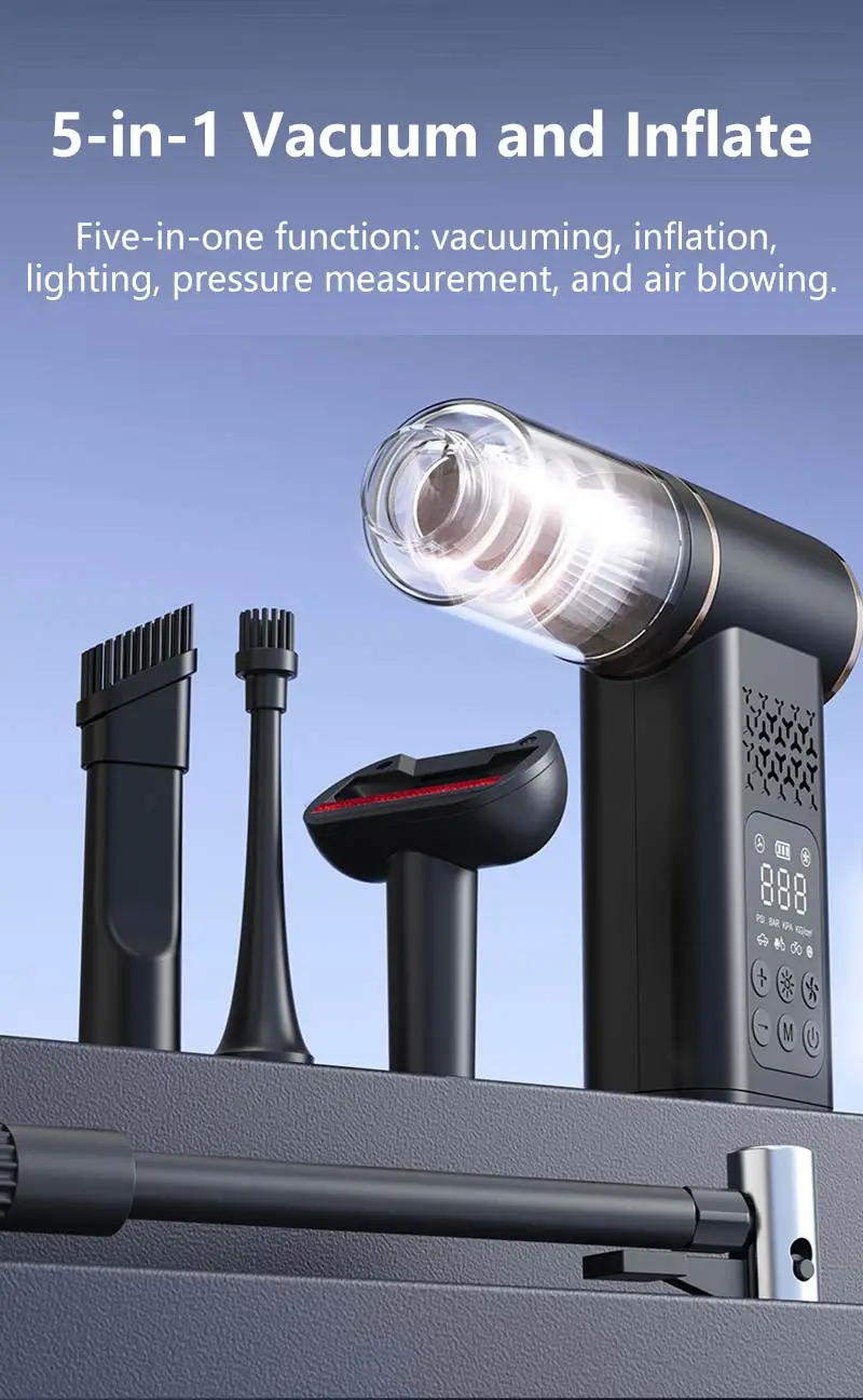 VaxaPump™ Pro is a high-performance car tire inflator featuring an intelligent auto-shutoff system and a precise digital pressure gauge to ensure your safety on every road. This versatile 5-in-1 tool is also a powerful cordless vacuum, perfect for deep-cleaning your car interior, and features an air blowing function to easily dust off electronics or inflate air mattresses. Complete with a multi-mode LED lighting system for nighttime emergencies, it is the ultimate compact and portable solution for every driver.